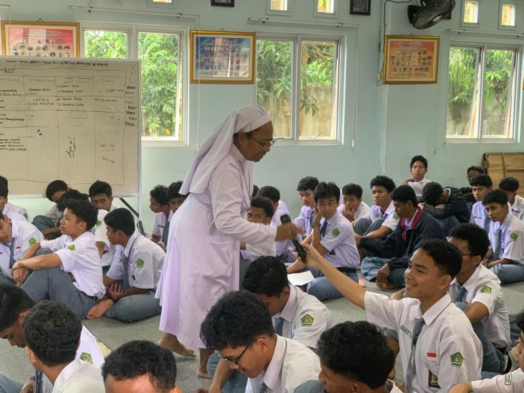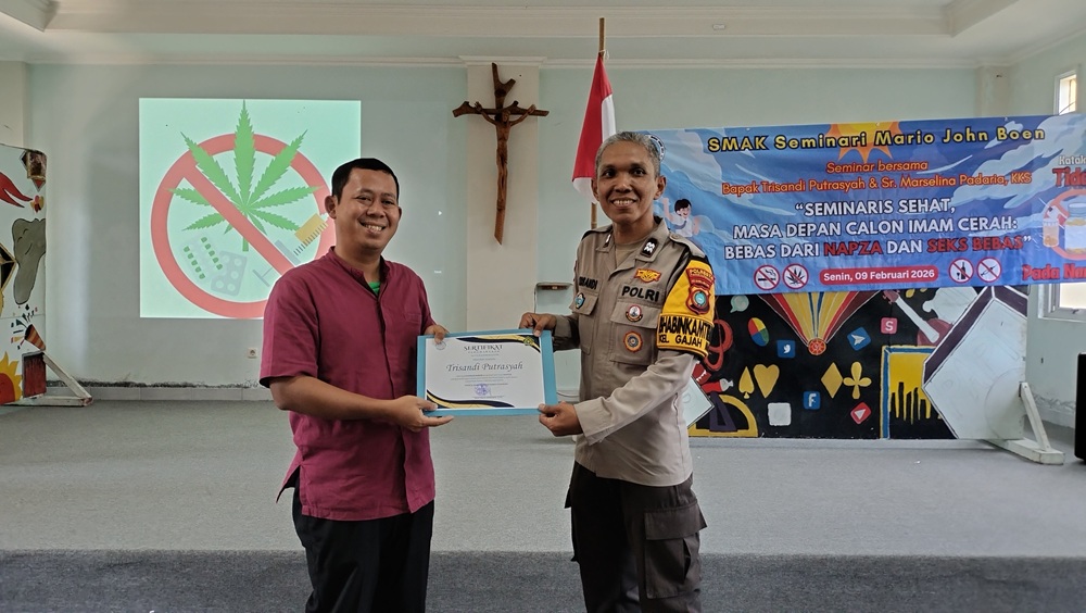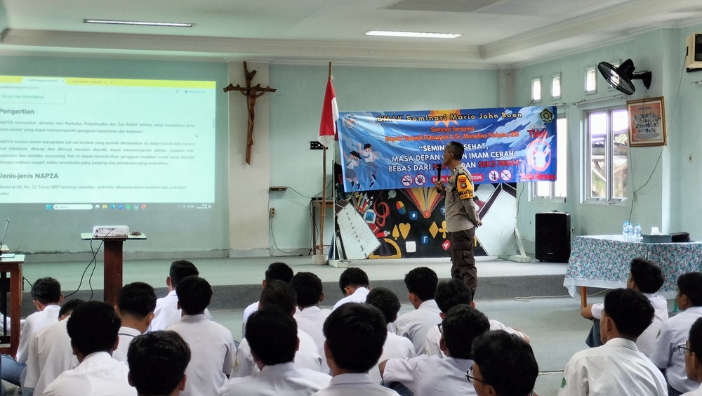 Pangkalpinang – Senin (9/1/2026), SMAK Seminari Mario John Boen Pangkalpinang menyelenggarakan kegiatan seminar yang berfokus pada NAPZA dan Seks Bebas. Hadir sebagai narasumber, Bapak Trisandi Putrasyah selaku Bhabinkamtibmas Kecamatan Rangkui dan Suster Marsellina Padarina, KKS atau yang akrab dipanggil dengan Suster Lusie selaku formator yang juga memberikan bimbingan konseling kepada para seminaris. Pak Tri mengusung materi NAPZA dan Suster Lusie membawakan materi tentang Seksualitas.