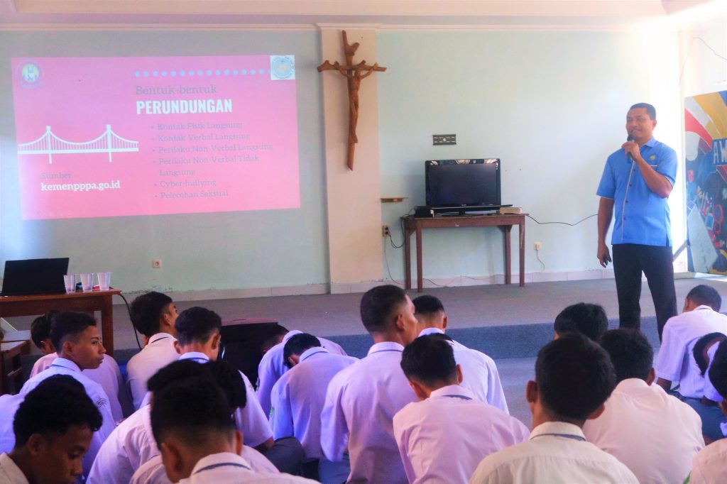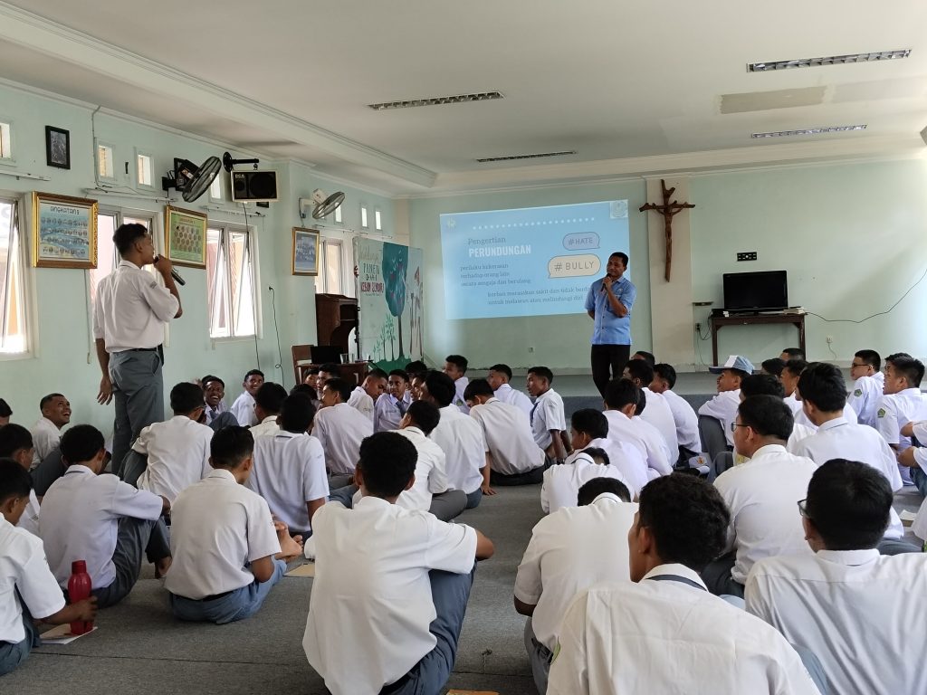Para peserta didik, pendidik, dan tenaga kependidikan SMAK Seminari Mario John Boen Pangkalpinang mengikuti kegiatan Seminar Anti Bullying pada hari Senin, 05 Agustus 2024 yang lalu. Kegiatan seminar ini mengundang Romo Servasius Samuel, selaku Ketua Lembaga Psikologi Terapan (LPT) Persona Pangkalpinang sebagai narasumber.